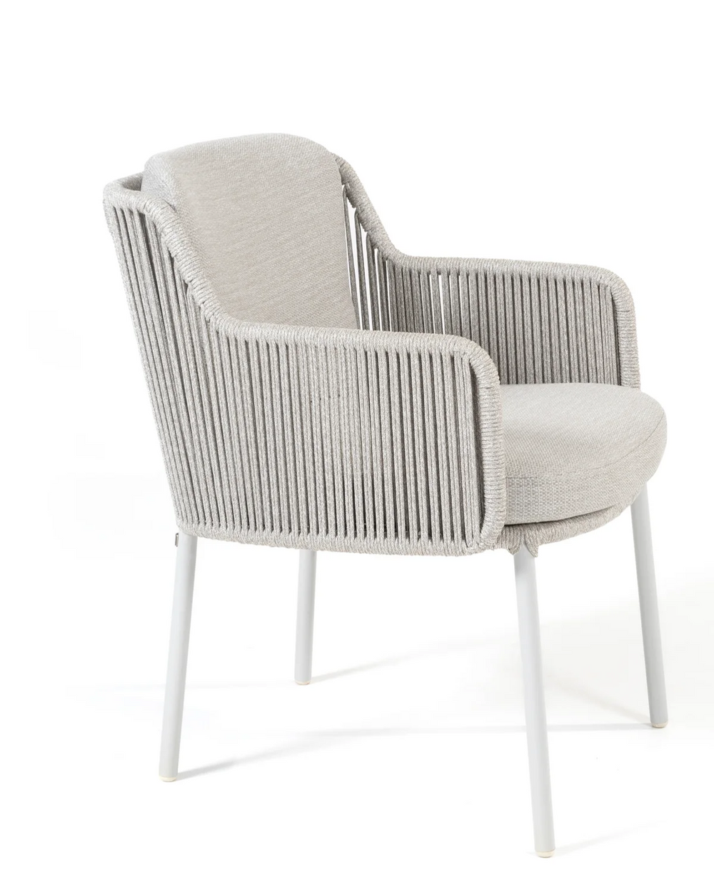 • Comfortable Dining Chairs: The Bernini Dining Chairs, crafted from stainless steel wrapped in intricate knotted rope, offer both style and comfort. The light, silvery grey rope perfectly complements the teak tabletop, while the all-weather seat and back cushions ensure comfort even during unexpected rain showers. Innovative design allows water to drain through the foam, while Dacron material keeps the cushions in shape.