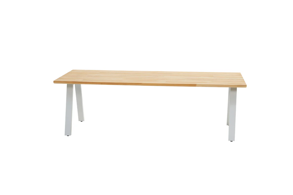 4 Seasons Outdoor Bernini six-seater rectangular dining set with metal frame and 240cm Ambassador teak dining table.