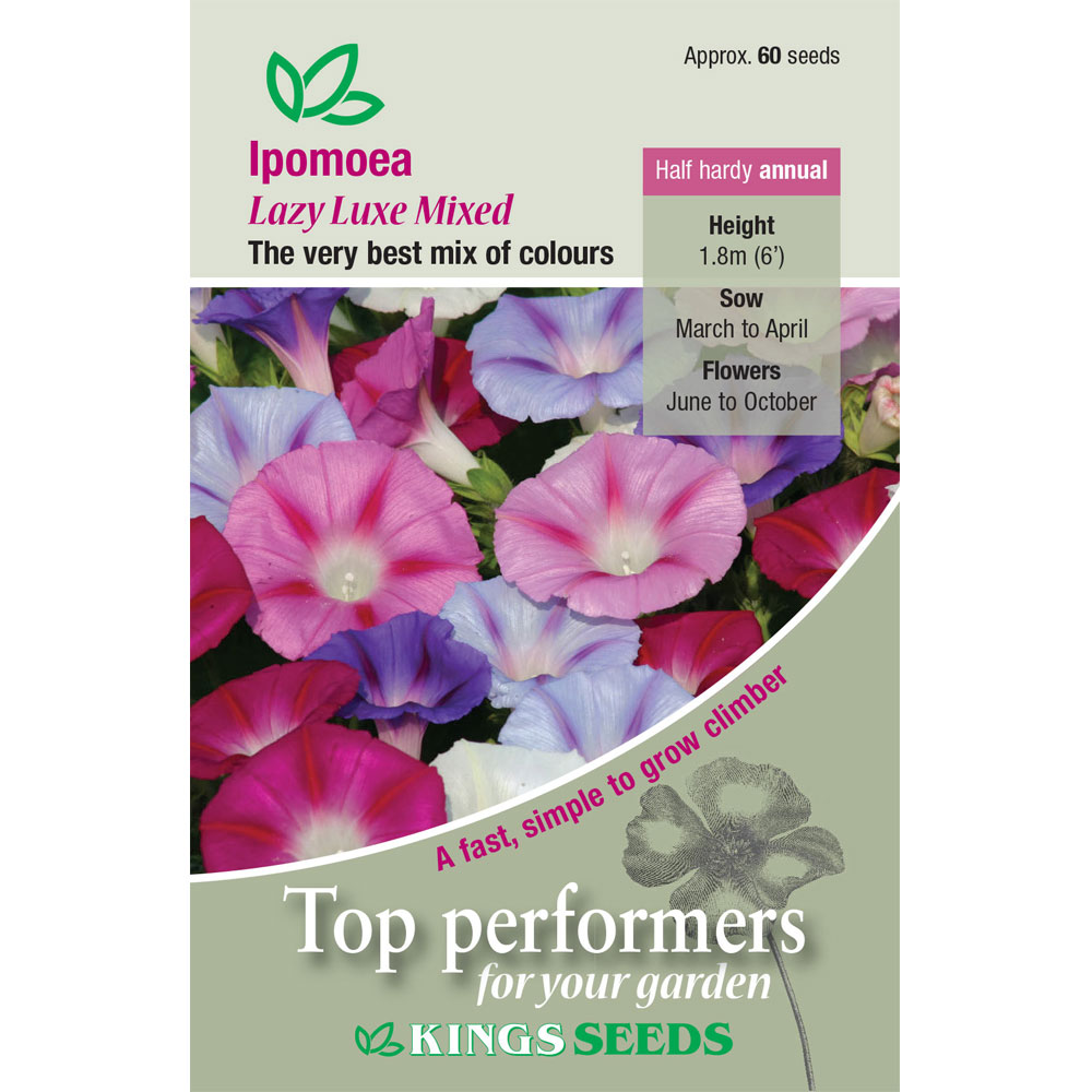Possibly the best ever mixture of Morning Glory. Top quality formula mixture of ten sparkling colours creates a stunning annual climber. Quickly covering fences, trellis or an obelisk in a container. Blooms all summer long.