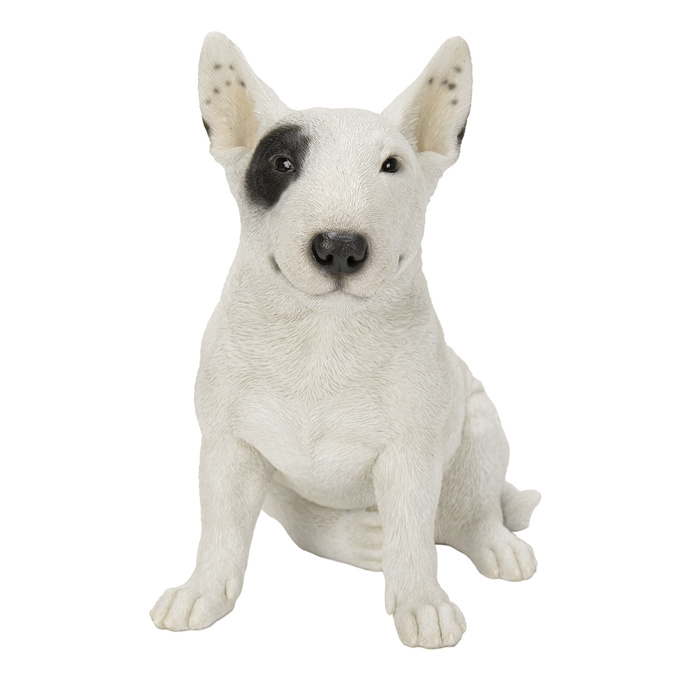 Vivid Arts black and white bull terrier resin ornament for outdoor decor, realistic dog sculpture for garden or patio.