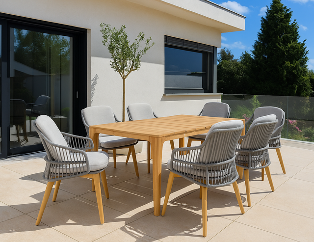 Transform your patio, terrace, or garden with the Ancora Luxury Outdoor Dining Set, where contemporary design meets durable craftsmanship. Designed by 4 Seasons Outdoor, this striking 6-seater dining set blends premium teak wood, powder-coated stainless steel, hand-woven rope detailing, and Olefin weather-resistant cushions—ensuring a stylish, low-maintenance solution for year-round outdoor living.