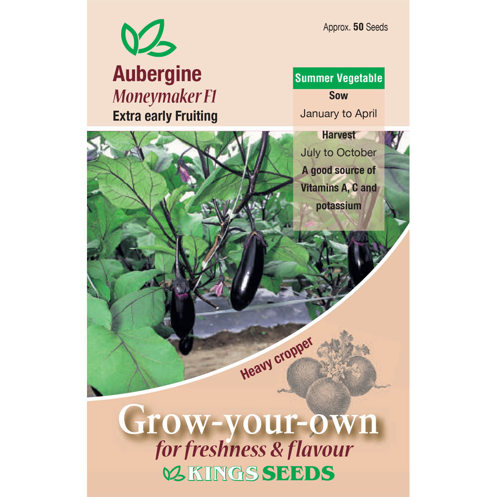 Moneymaker F1 seeds produce glossy black, semi-long fruits with deep purple calyx. They are very productive, extra early maturing variety. Moneymakers don't have a bitter taste that other varieties can have. Each plant can grow up to 8 fruit, each around 100g. Aubergines can be easily produced in Britain, either raised in a glasshouse or plastic tunnel, in grow bags, in a sheltered sunny spot in a garden or even on a patio in a tub if sheltered from cool winds.