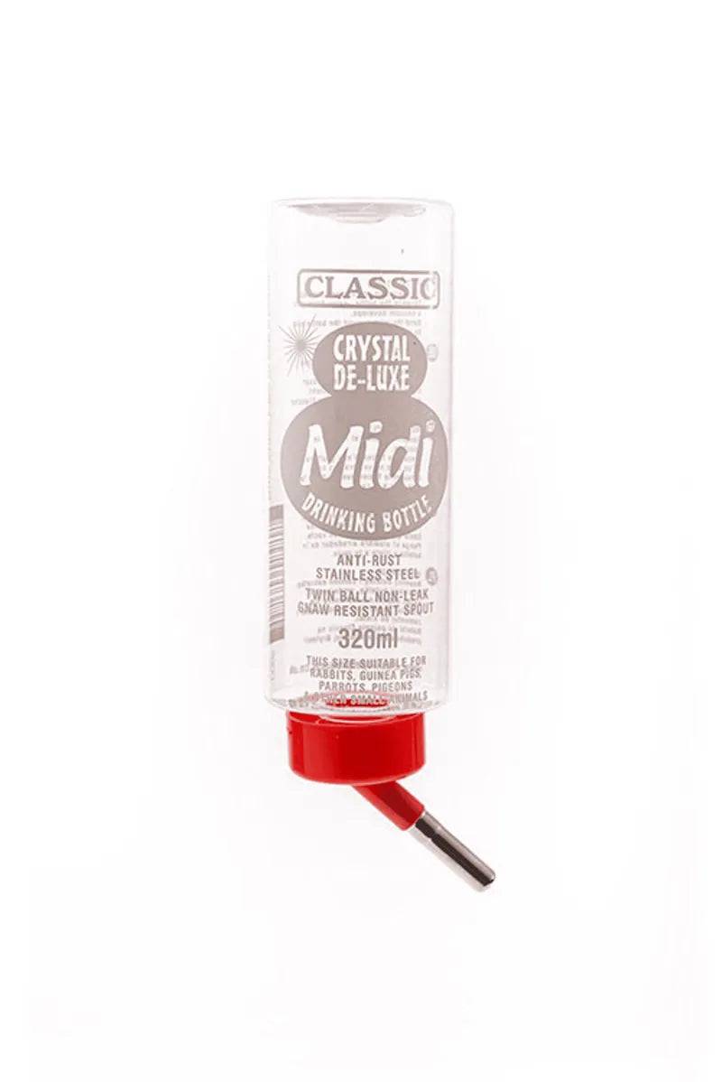 Crystal Deluxe Midi Bottle 320ml is suitable for Rabbits, Guinea Pigs & other small animals. Helps keep water clean and healthy. Shatter resistant in the cold weather. Anti-rust stainless steel spout. Twin-ball, non-leak design. Gnaw resistant angled cap assembly & Fixing wire included
