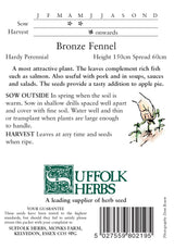 There is nothing quite like using your own home grown herbs from your garden to flavour your cooking or salads. Fennel Bronze has delicate feathery bronze/red leaves which have a pleasant ainseed flavour. This variety is not quite as hardy as the green type. The seeds and leaves can be used in pickles and cooking. This herb grows to about 150cm.,Seed Count: 300,WHEN TO SOW Spring when the soil is warm WHERE TO SOW Sow in shallow drills spaced well apart and cover with fine soil. Water well and thin or transplant when plants are large enough to handle. Full sun is needed with well-drained soil. Avoid clay soils. HARVEST Leaves at any time and seeds when ripe. Bulbs should be dug up in the autumn USES To preserve, freeze leaves or infuse in oil or vinegar. Dry the seed. HANDY TIP Grind 4 tbsp of fennel seeds with 2 handfuls of thyme leafs, two bay leaves and 2 gloves of garlic, add some ground black pepper and pinch of salt to make a delicious rub for any red meat.
