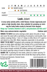 Not only is the leek a well known tasty winter vegetable, but its root system has the added advantage of improving heavy soils. Leeks are in the ground for quite a long time and do take a fair amount of work, but they really are worth all that effort; so its not surprising they will be found on almost every vegetable plot. Jolant is a very early variety with a mild flavour. You can use for mini-veg or grow on to harvest form August onwards. It grows vigorously and gives a high-density stem. Delicious when sliced, boiled and covered in cheese sauce for a tasty addition to a roast dinner.,Seed Count: 200,WHEN TO SOW March to April WHERE TO SOW Sow the seeds thinly in a well prepared seed bed in shallow drills 2cm (