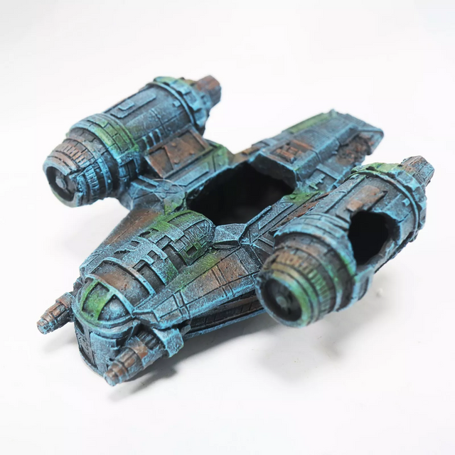 This Razor Crest gunship has fired its last bullet and come to a rest in a beautiful underwater environment.