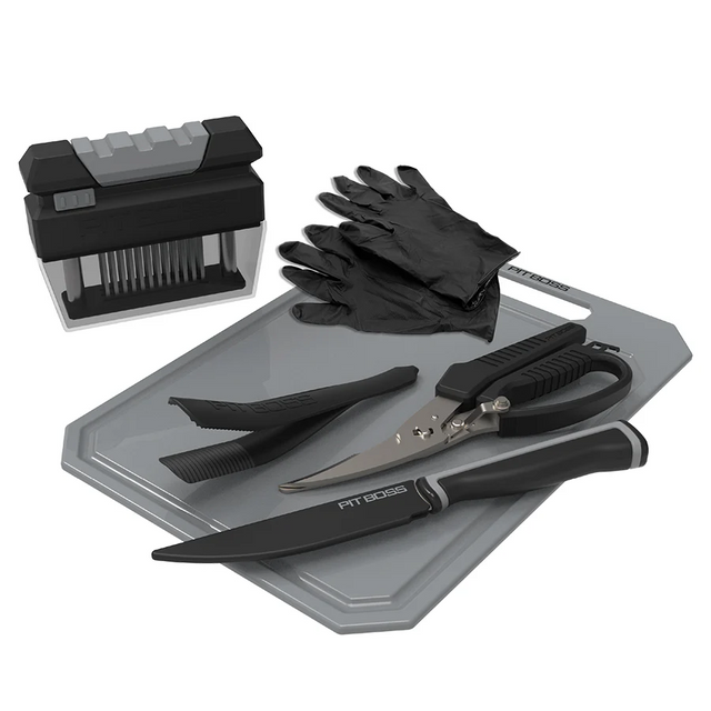 - Includes: cutting board, meat tenderizer, rib prep tool, BBQ shears, trimming knife, and 10 disposable nitrile gloves.