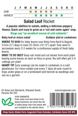 Grow your own tasty colourful salad leaves which are packed full of nutrients. There is nothing quite as special and rewarding as going out to your own garden and selecting home grown produce to use in your meals. A definite must for any summer salad. Rocket Salad boasts delicious spicy dark green leaves which are very simple to grow. The best way to grow this seed is to sow successionally and can be used as a cut and come again variety.,Seed Count: 1,000,WHEN TO SOW February to September. WHERE TO SOW February and March sowings direct into soil in cold frame or under cloches. Later sowings in open ground, sow in shallow drills about 1cm deep in rows 25cm apart. WHAT TO DO NEXT Thin out seedlings as they grow to final spacing of 15cm. MATURITY Three or four weeks from sowing. HANDY TIP Pick leaves regularly as plants will quickly run to seed. Sow in small plots each month to ensure continuous supply of leaves.