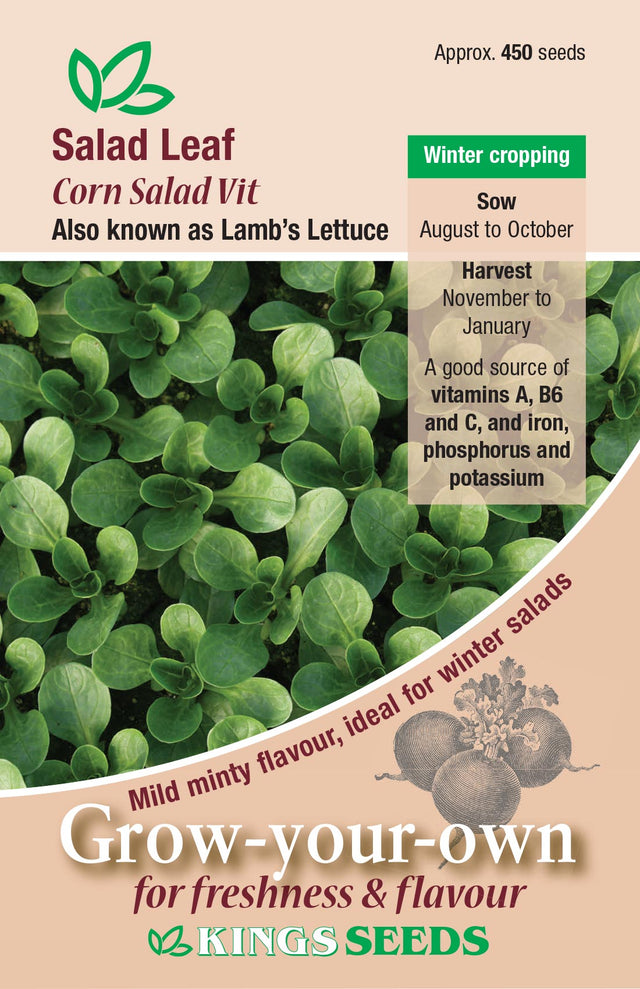 Vit is a very vigorous variety for spring and autumn crops as well as overwintering. It produces long glossy green leaves with a delicious tender mild minty flavour. Lambs Lettuce makes a good addition to salads, but use sparingly as it has a bitter taste.