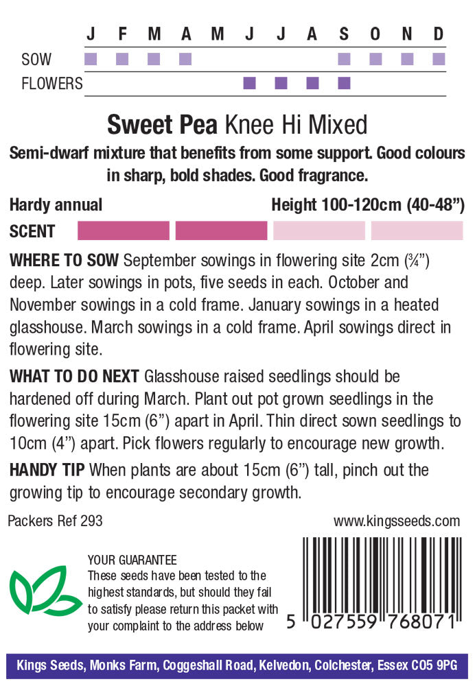 A semi dwarf mixture which will benefit from some support. Good colours in sharp bold shades and a good fragrance.Kings seeds recommend sowing seeds into a good quality seed sowing compost and water only with tap water . Do not use butt water as this can contain harmful pathogens , resulting in poor germination.