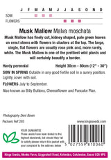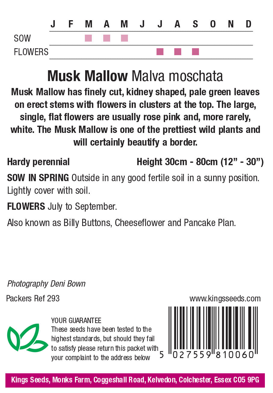 Musk Mallow has finely cut, kidney shaped, pale green leaves on erect stems with flowers in clusters at the top. The large, single, flat flowers are usually rose pink and, more rarely, white, and will certainly beautify any gardenborder. It willflower fromJuly to September and can reach aheight range of30cm-80cm (12''-30'').
